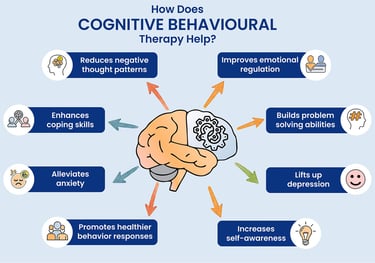 Cognitive Behavioural Therapy (CBT) is a structured, evidence-based approach that focuses on the connection between thoughts, emotions, and behaviours. Using tools such as the ABC model, CBT helps clients understand how activating events influence beliefs and emotional responses. Through guided discovery and cognitive restructuring, individuals learn to identify and challenge unhelpful thinking patterns, including catastrophising, replacing them with more balanced perspectives. CBT also emphasises practical change through behavioural experiments, exposure therapy, and activity scheduling, supporting clients to test fears, reduce avoidance, and re-engage with meaningful activities. Techniques such as mindfulness, physical relaxation, cognitive journaling, and role-playing help strengthen emotional regulation, self-awareness, and coping skills. Rather than focusing on the past, CBT is present-focused and collaborative, aiming to empower individuals with tools they can use beyond therapy to improve wellbeing and resilience.